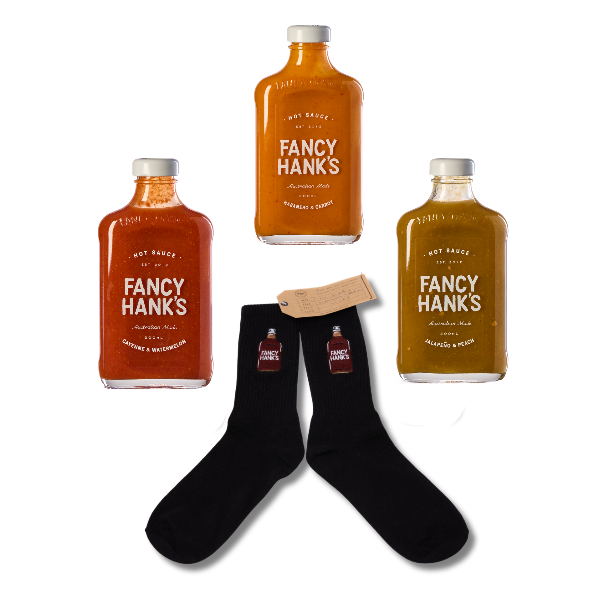 These bring the heat — and the drip — with two of our boldest hot sauces and a pair of very snazzy Saucy Socks.