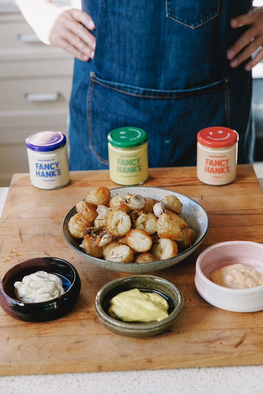 "Extra chicken salt, please" - a phrase familiar to all Aussies. Well, you asked and we listened - we've added our classic Chicken Salt to our free-range egg yolk mayonnaise to create a flavour bomb that will knock your socks off. The best part? This baby is vegetarian. Made with Free range Aussie egg yolk, American mustard and Fancy Hank's secret umami flavour.