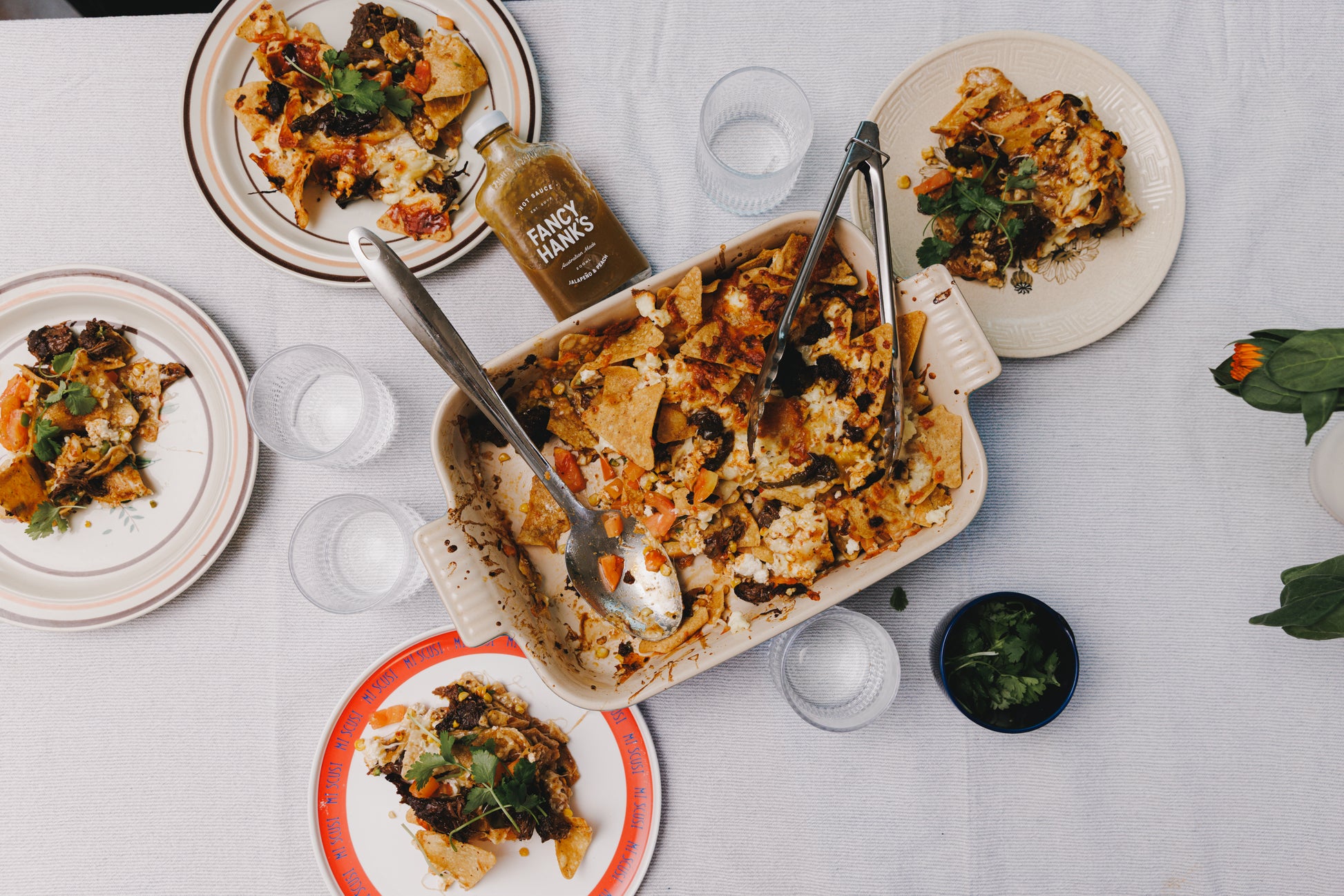 - Slow brasied beef cheek nachos with extra cheese finished with Jalapeno and peach hot sauce.